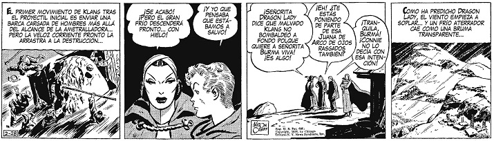Historias en sí muy divertidas. La narración y el ritmo de Caniff son extraordinarios en todo, y así es como Terry y los Piratas brilla con luz propia y fluye. Comienza guay, avanza rápidamente y parece haber soportado bien el paso del tiempo. Insisto, siendo conscientes y sabiendo desde un principio el tipo de cómic que tenemos entre manos y lo que supone leerlo hoy en día, sobran las comparaciones a los títulos que se editan actualmente. Estamos hablando de una obra con más de ochenta años, friends. Sepamos valorar eso. Y si nunca ha leído series de tiras cómicas, os diré que producirlas en su formato original es un arte en sí mismo. La primera de cada una de las tiras diarias (de tres o cuatro paneles) debe resumir rápidamente lo que sucedió antes. Y la tira final normalmente presenta algún tipo de suspense para que te lances rápidamente a “comprar el periódico” del día siguiente.