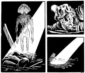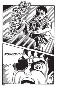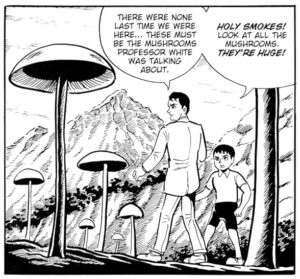 La narrativa de La invasión de los hongos del espacio es muy directa y el arte roza lo crudo. A Shirakawa le gusta incluir grandes bloques de texto y varias páginas donde incluye cuentos populares sobre monstruos con forma de hongo. Mi parte favorita fue probablemente cuando el pequeño protagonista se queda ciego del ojo izquierdo y piensa: «Bueno, al menos así me veré más guay». Jajaj. Luego lleva un parche en el ojo durante el resto del tomo, excepto por una página doble donde, impactado, su ojo izquierdo reaparece de repente. Pero no me preocupa eso. Es el cómic, el manga, el libro que es, y lo encuentro entrañable al igual que las pelis que os comentaba al principio donde también encontrabas fallos del mismo tipo. Pero también hay dibujos terroríficos de personas convertidas en monstruos hongos, y algunos momentos estremecedores que hacen que valga mucho la pena tener este título en tu cómicteca si de verdad amas este género.