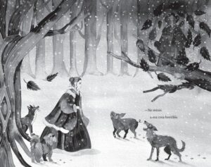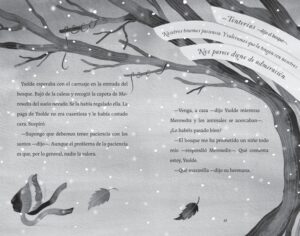 Una trama donde el solsticio de invierno se presenta como un momento de paz y contemplación, mientras la historia lleva al lector a un viaje serpenteante por un clásico de esos que dan algo de miedo también. Seguimos a la protagonista en su búsqueda de un lugar tranquilo para reflexionar pero también la búsqueda de la guía de dicho bosque, donde el estilo artístico de Sawdon complementa a la perfección la escritura de Clarke. Porque no hay que olvidarse de que estamos ante una precioso libro ilustrado. Además, el diálogo que pronuncian los árboles se representa como estandartes que se envuelven alrededor de sus troncos u ondean con la brisa, mostrando que no necesariamente hablan como una sola entidad, sino que hablan en armonía… Y es que aquí conocemos a Merowdis Scot, una joven de diecinueve años que posee una habilidad extraordinaria y que sólo se encuentra verdaderamente feliz cuando se adentra en los bosques. Pero una tarde de nieve, acompañada por sus perros y la cerda Manzana, Merowdis se encuentra con un mirlo y un zorro y al caer la noche, una enigmática figura se une a ellos…