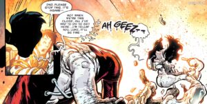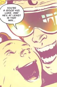 La Liga de la Justicia riéndose y cambiando de tema ante el problema… Cantwell posiblemente nació para escribir Plastic Man. Ofrece aquí una visión perfectamente equilibrada de un personaje con increíble incisividad y sensibilidad, encontrando una voz cómica audaz para él, que se siente poderoso y consistente a lo largo de todo este drama. Eso es muy difícil de conseguir. Además, el guion juega fantásticamente con las expectativas preexistentes, aprovechando la (mala) reputación de Plastic Man como personaje cómico de alivio y convirtiendo esto en la piedra angular de su ruina. Lidia con la mortalidad de una manera carnal y plena, algo que rara vez se hace en los cómics.