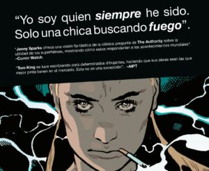 No es difícil, en realidad, hablar de los cómics o guiones de Tom King. La mayoría de sus guiones Big Idea tienden a presentar una tesis que puede o no ser evidente en el primer número, y expone argumentos y los explora a medida que la serie avanza… Son cómics que enganchan como pocos, me atrevo a decir, algo que hace casi con cualquier personaje que toque, pero su objetivo a menudo no queda claro hasta el final de la serie y ese es su poder. Es lo que te mantiene enganchado como me ha tenido en los dos últimos días este tomo que recoge los siete números de la miniserie Jenny Sparks. Una trama que he devorado pese a que contradice deliberadamente la naturaleza del Universo Wildstorm del que proviene el personaje principal.