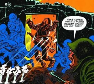 Porque aquí encontraréis historias dedicadas por completo a la reñida retirada de los marines del embalse coreano de Changin. Cuatro historias interconectadas, cada una con un punto de vista narrativo distinto, que siguen a los marines rodeados luchando por regresar al puerto norcoreano de Hungnam para ser evacuados. Y la historia final es desde la perspectiva de un perro callejero, abandonado en un muelle desierto, que observa cómo se marcha el convoy de la ONU mientras todo el puerto, que ha sido arrasado, arde en llamas a su alrededor… Wow! Originalidad a punta-pala en tramitas poco desarrolladas, y para mayor virtud, en un cómic hecho en los años 50 del pasado siglo, no se os olvide. Además de las historias de la guerra de Corea, Kurtzman y sus artistas