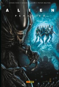 Un equipo de policías encubiertos es enviado a la isla vacacional de Paradiso para frustrar un posible acuerdo. Sin embargo, cuando Valentine llega con aspecto enfermizo, los habitantes de la isla podrían llevarse una sorpresa desagradable, ¿no creéis? Ya que estamos en una historia dentro de la franquicia Alien, aquí la people lo va a pasar mal. Porque Alien: Paradiso, de Steve Foxe y muchos autores más de los que después hablaré, es otro genial tomito que publica Panini Cómics en nuestro país, otra miniserie para el que fan se deleite y no caiga en el ostracismo. Un guion que os adelanto ya que atrapa al lector y juega con nuestros miedos a ser perseguidos por lo desconocido además de utilizar bastante un recurso muy chulo (muy a lo Breaking Bad), como es el hecho de ir hacia delante y hacia atrás en la historia con la idea de ambientar pasado, presente y futuro para el lector y así el miedo se desarrolle en esos tres lapsos de tiempo.