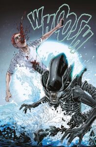 Un cómic que comienza con una escena aterradora donde nuestros personajes son perseguidos y acechados por lo que resulta ser el Xenomorfo. Desde el principio, Edgar, Victor y Carlos muestran la brutalidad que puede afectar a cualquiera que se cruce en el camino de un Xenomorfo, con escenas sangrientas de cabezas cortadas por la mitad y la criatura usando su cola con púas para atravesar el pecho de sus víctimas… Y la historia pasa de la brutalidad a un cambio de tono con colores brillantes y un ambiente vacacional, algo que el equipo artístico maneja de maravilla y así se prepara el terreno para la trama.