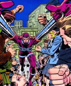 número #10, con guiones de Marv Wolfman primero y luego de Tom De Falco, pero el verdadero guionista fue Steve Ditko, quien hizo tanto los lápices como las tintas. Un Ditko bastante minimalista, cuyo estilo iba en declive, y más de quince años después de su debut en Marvel, su estilo de dibujo rozaba lo aceptable, a menudo caricaturesco sin pretenderlo, con mujeres que deberían ser bellas pero que resultan desagradables y rostros demasiado parecidos. Y a mí esto, entonces, me hacía gracia pero no lo detestaba. Me molaba. Y en esa onda estoy ahora que he vuelto gracias a estos tomitos. Me encantó, me encantó, ME ENCANTÓ la parte de Kirby de estos volúmenes. Su arte es impresionante, las secuencias de acción son increíbles, la historia es sólida. Y todo eso sigue vigente, cuarenta-cuarenta y cinco años después de haber sido escrito/dibujado.