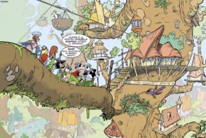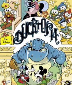 Ducktopia es una joyita en si misma. Estamos ante un genial tomito que recopila una serie de historias chulas que, en realidad, son un homenaje a varias series de Fantasía, aunque —debo admitir— que creo que no reconocí todas las referencias. Excepto la de Geralt de Rivia, con quien tengo una larga cuenta pendiente. Pero puedo decir sin miedo a equivocarme que disfruté las historias de principio a fin. Y cuando llegó el momento de desentrañar el misterio… pues en esa parte me quedé un poco extrañado. No me lo esperaba. Quizás hubiera preferido que fuera una historia independiente, en la que nuestros héroes desempeñan sus papeles sin tener que regresar a Patolandia o Duckburgo. Pero bueno, no quiero adelantar acontecimientos y sí que debo adelantar que este cómic, en esta maravillosa edición Disney Limited Edition que vuelve a publicar Panini Cómics, vais a encontrar páginas dobles fabulosas y dibujos evocadores. Dos páginas dobles fabulosas que te sientes como si estuvieras en el corazón del cómic.