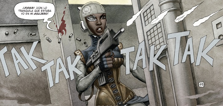 Aquí estamos de nuevo con un tema visto y revisado a menudo; el mundo de abajo y el mundo de arriba. No obstante, cuando esto sucede, tienes que ver si “el camino” es disfrutable. Y lo cierto es que uno espera de Nathanaëlle alguna originalidad, más escenarios post-apocalípticos o un whisky con sabor a milhojas. Pero no lo hay. La originalidad de Nathanaëlle está en sus personajes y en un tono, no sé muy bien como explicarlo, un mundo muy gris, un mundo basado en el metal como guión. Todo muy frío. El frío del metal, el sabor de la sangre. Como la trama que se centra en la relación entre Nathanaëlle, hija del gran sabio Tàbor, y Melville, una máquina de café robot.